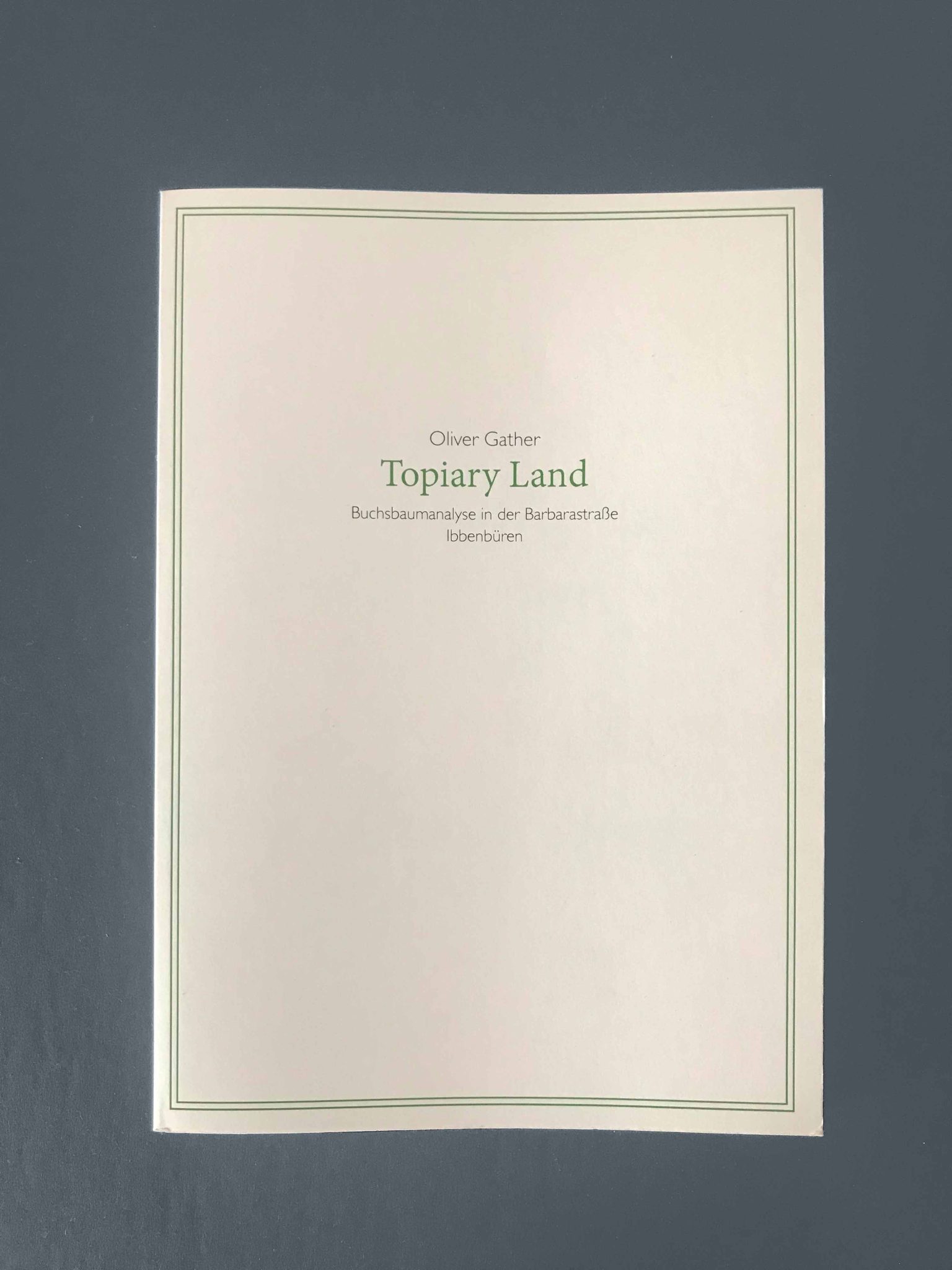 This is the second time that artist Oliver Gather has been given the opportunity to realize one of his subtle participatory projects as part of this grant. As with his 2014 artistic investigation on the subject of “self-making and self-discovery”, the communicative aspect is at the forefront of his artistic “field research”. Once again, Gather leaves his studio and the museum-like exhibition space to talk to local residents, collect and reorganize their ideas in order to ultimately develop a systematic approach that enables his own view of things. Front gardens, in particular their planting with boxwood and other shrubs, which are always exposed to a vehement horticultural will to design through topiary, are the focus of this artistic analysis.