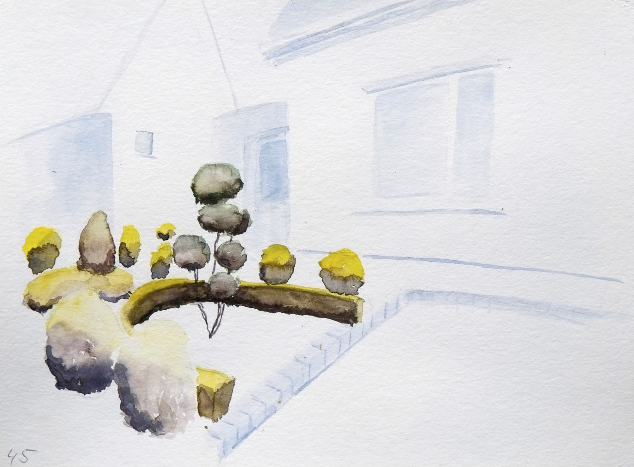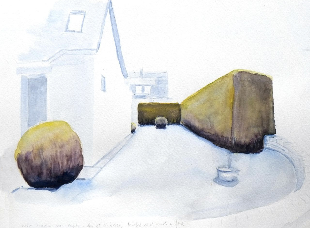 The front gardens of Barbarastrasse in Ibbenbüren have undergone many changes. Developed as a miners’ housing estate in the 1950s, the original use of fruit trees changed over time to rows of fir trees and lawns behind the hunter’s fence to a comprehensive dominance of arrangements with trimmed bushes and small trees. As if there were an unspoken rule, almost all homeowners now use the same plant material, which is rather unnatural for our latitudes, to furnish their front gardens in an individual and special way, but at the same time in the same way as the neighboring gardens. Space-consuming installations of cubes, spheres, cones and lines are created in an astonishing variety – the type of arrangement has a kinship with the compositional criteria of strictly formal, minimalist art. Sometimes systematically structured, sometimes enigmatically arranged, between nature and artificiality, free growth and order, they mark the area between house and street, as a peculiarly organizing spatial zone between the private and the public. But the period of the topiary front garden also seems to be over. The boxwood borer and a fungal disease are massively decimating the population, and a progressive pragmatism may soon transform the front gardens into paved and gravelled areas in which the vegetation is replaced by stone steles. One summer, I was a guest in Barbarastrasse to take a closer look at the front gardens there.