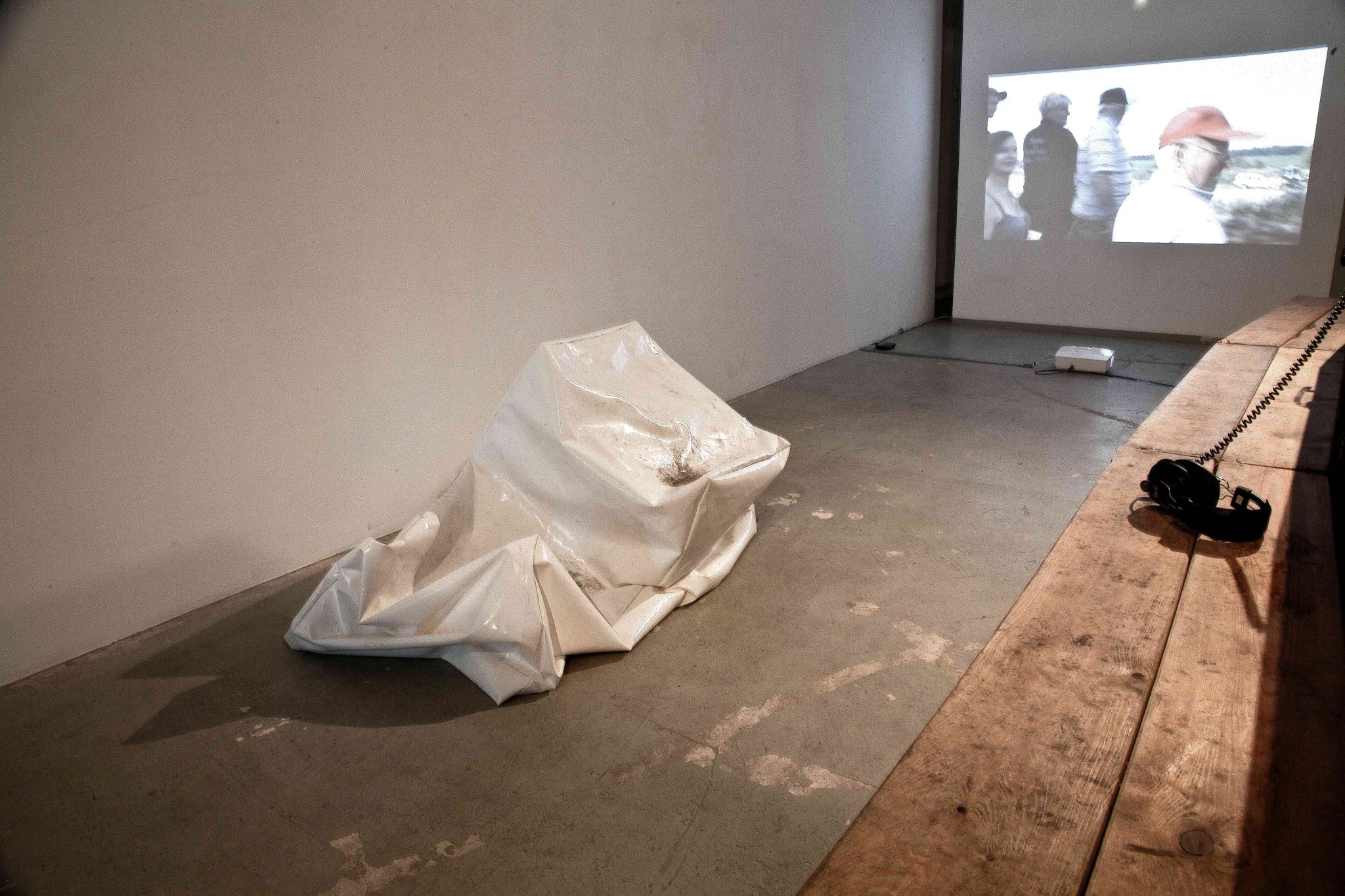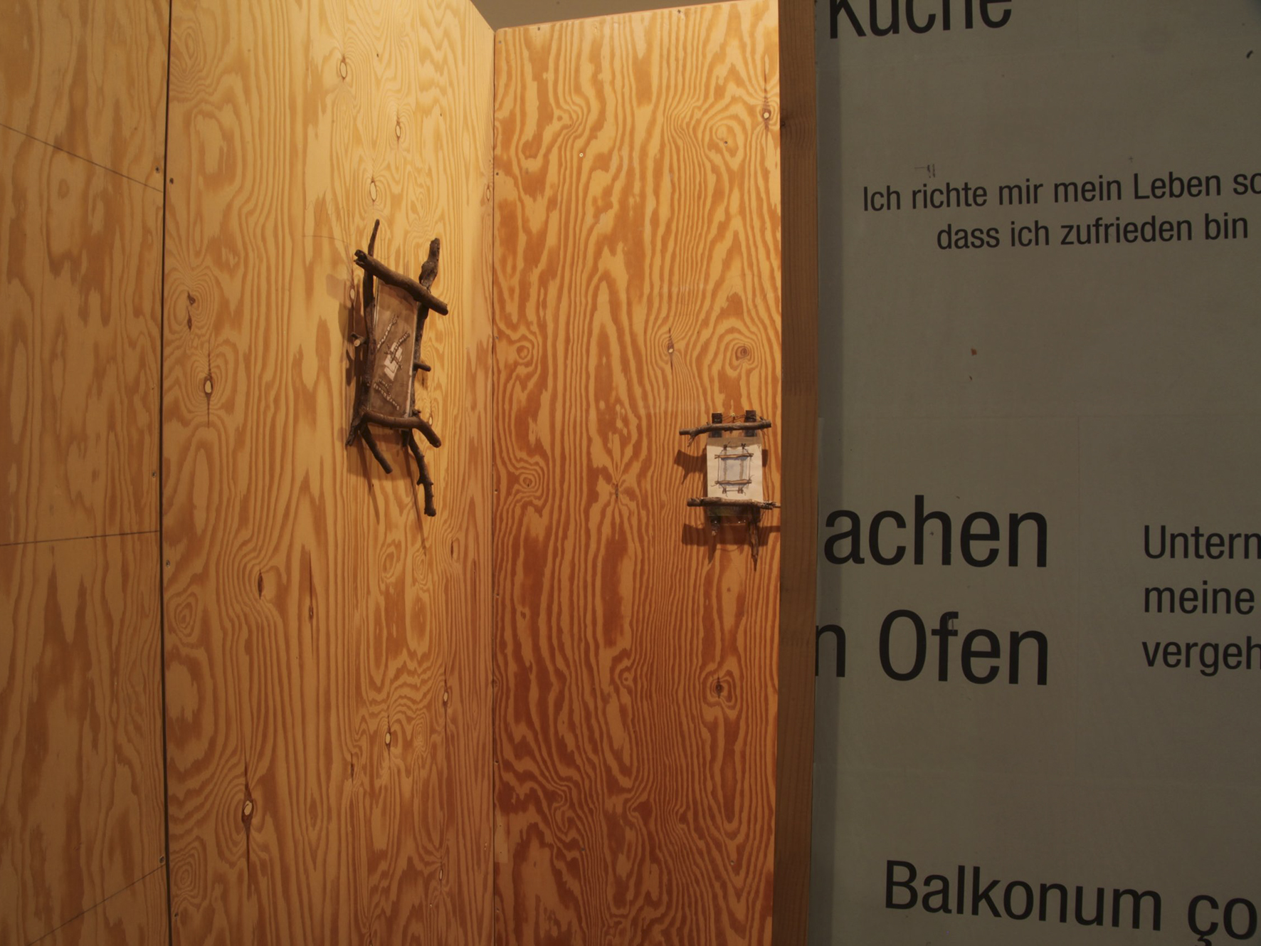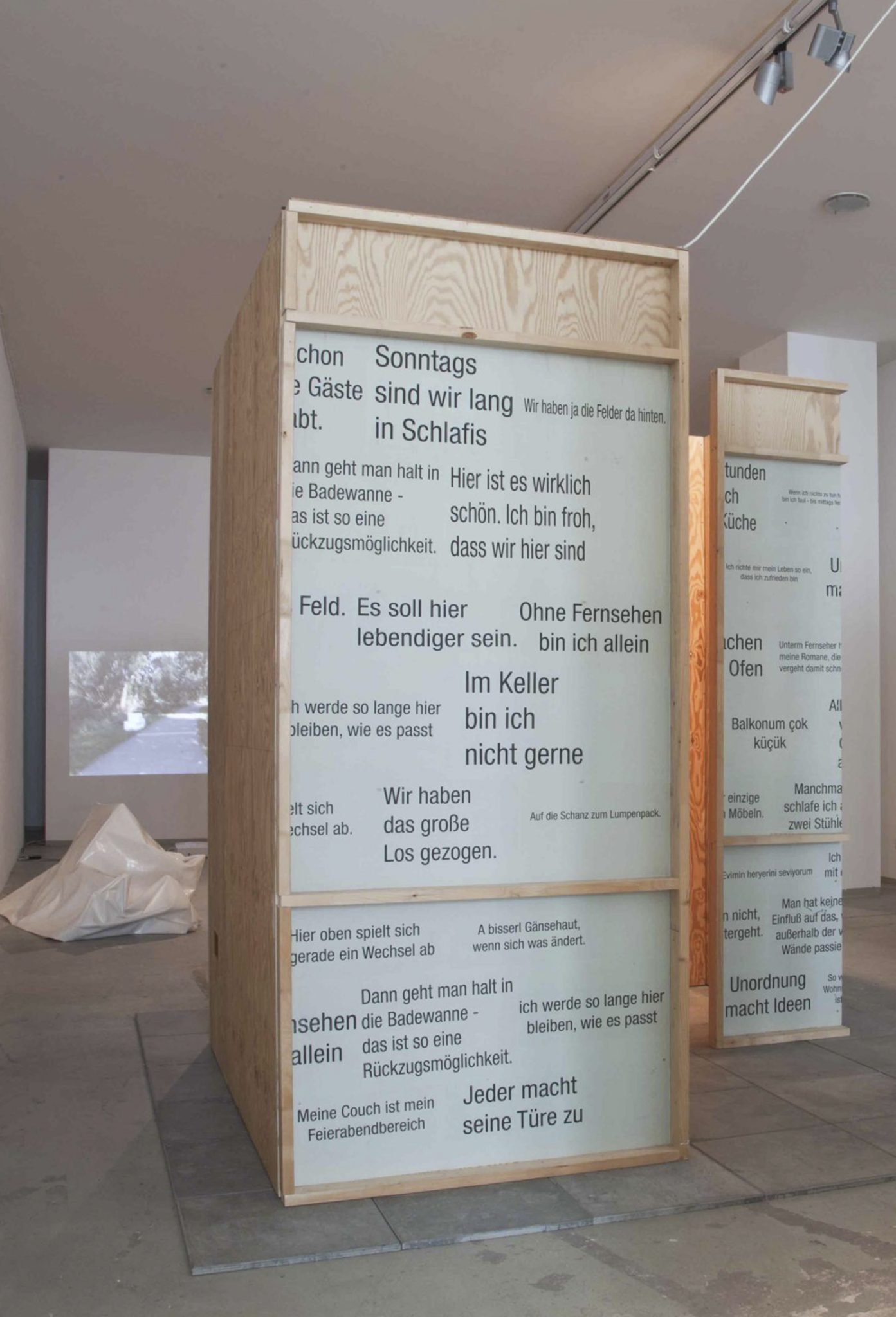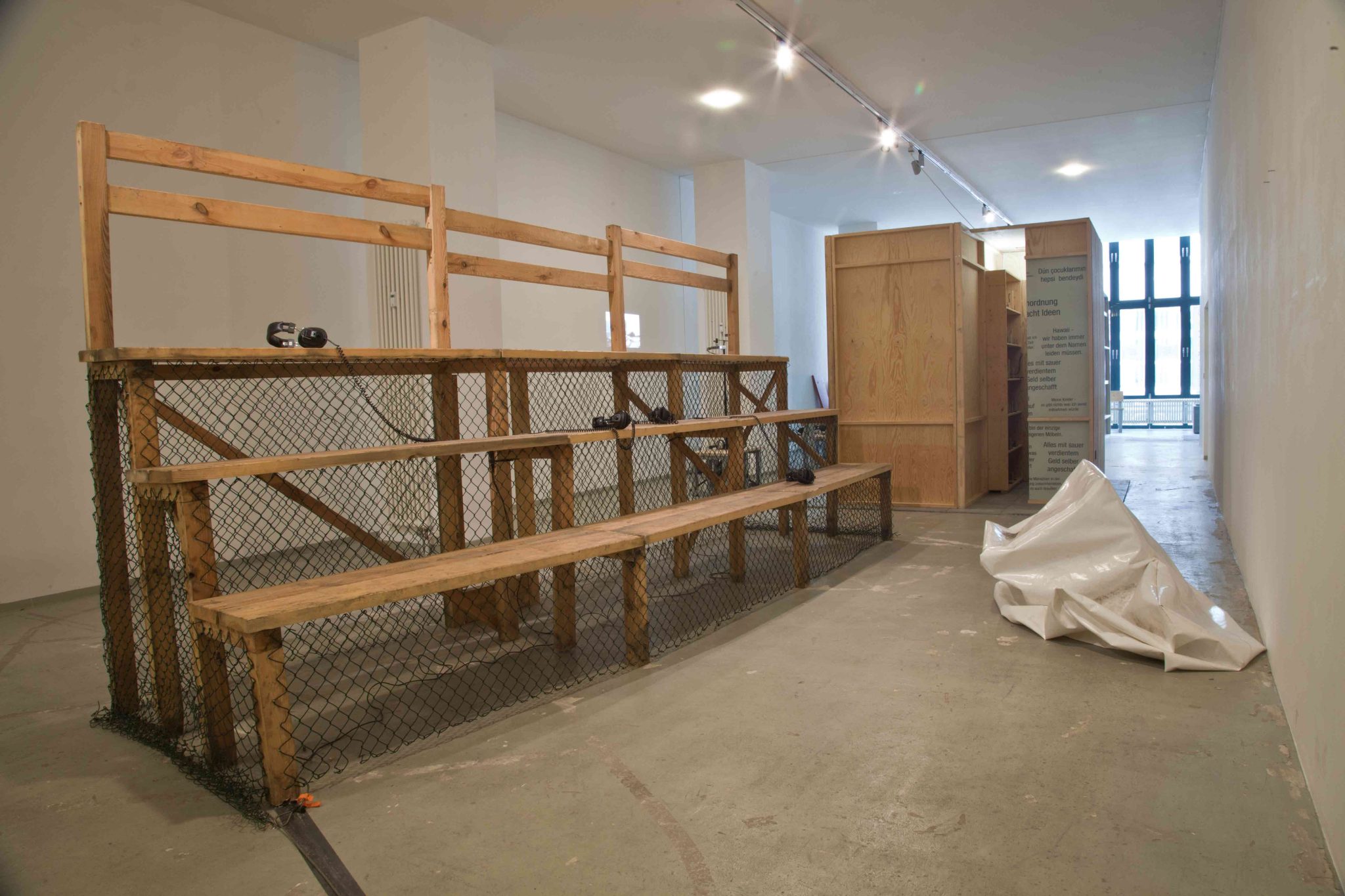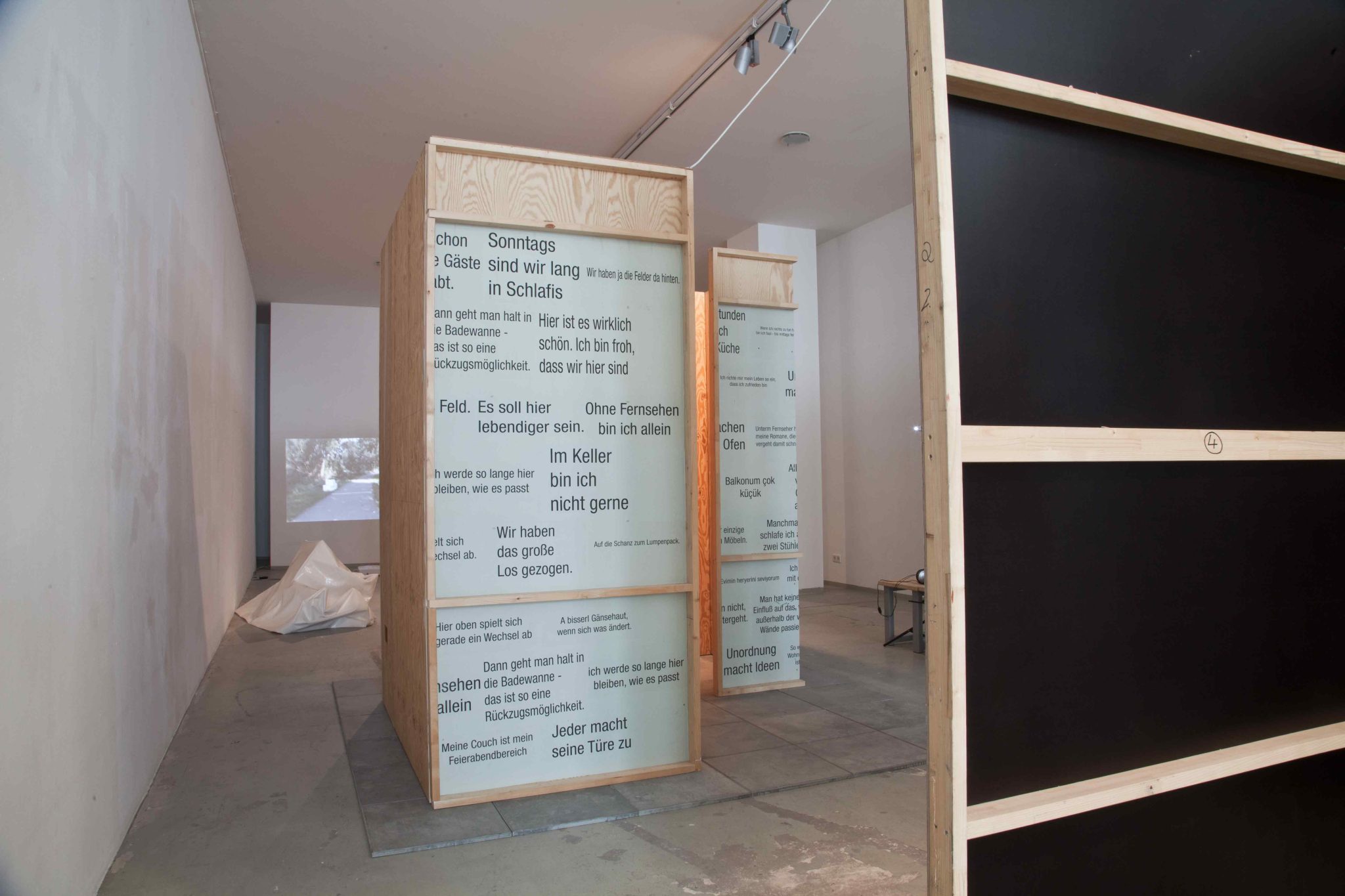 “In ‘wohnen – abschreiten – sortieren’, Gather experiments with the interweaving of art projects, which he has realized in many German regions and abroad with a clear contextual reference, and the semi-public exhibition space. In a combination of “leftovers” from art events in the outdoor space and works created especially for the art space, a strangely enraptured spatial structure between staging and documentation unfolds. Things with obsolete functions are presented as partly autonomous, partly usable sculptures or as exhibition architecture. Attached works and films thematize suspended actions and beautiful but dilapidated objects.” Erik Schönenberg, Neuer Kunstverein Wuppertal