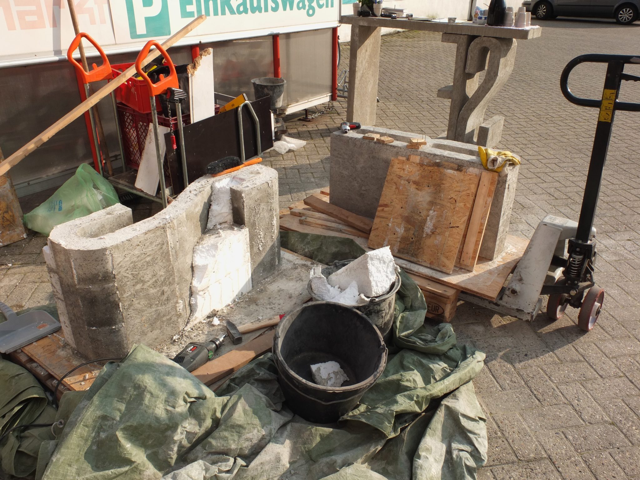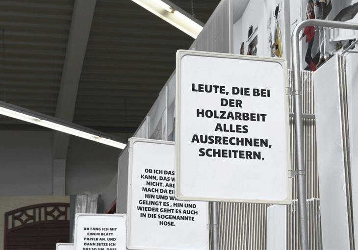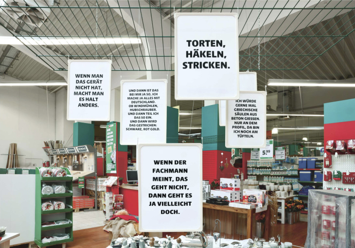 Oliver Gather has been exploring these questions on his construction site in front of Hagebaumarkt Bruns in Hörstel and has been asking visitors and customers of the DIY store about their projects, plans and ideas since mid-August. During this time, he built a counter-high concrete sculpture in front of the entrance to the DIY store in the form of the lettering SELBST. Visitors were able to watch the artist at work for six weeks. This led to conversations about SELF-making, in which the word sculpture served as a counter for discussion and for sketching (self-made) projects. In over a hundred conversations, Oliver Gather asked for thoughts on DIY. The resulting collection of aphorisms was displayed in the DIY store between goods and price tags.