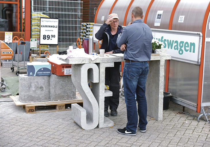 A construction site has even been set up in front of the DIY store. Here, formwork is being laid, concrete mixed and poured. Gradually, the letters of the word “SELF” are transformed into a concrete counter that invites people to chat over tea and coffee on the building site. It’s all about exchanging ideas about your own projects and philosophizing about the self. How much “self” do people need?