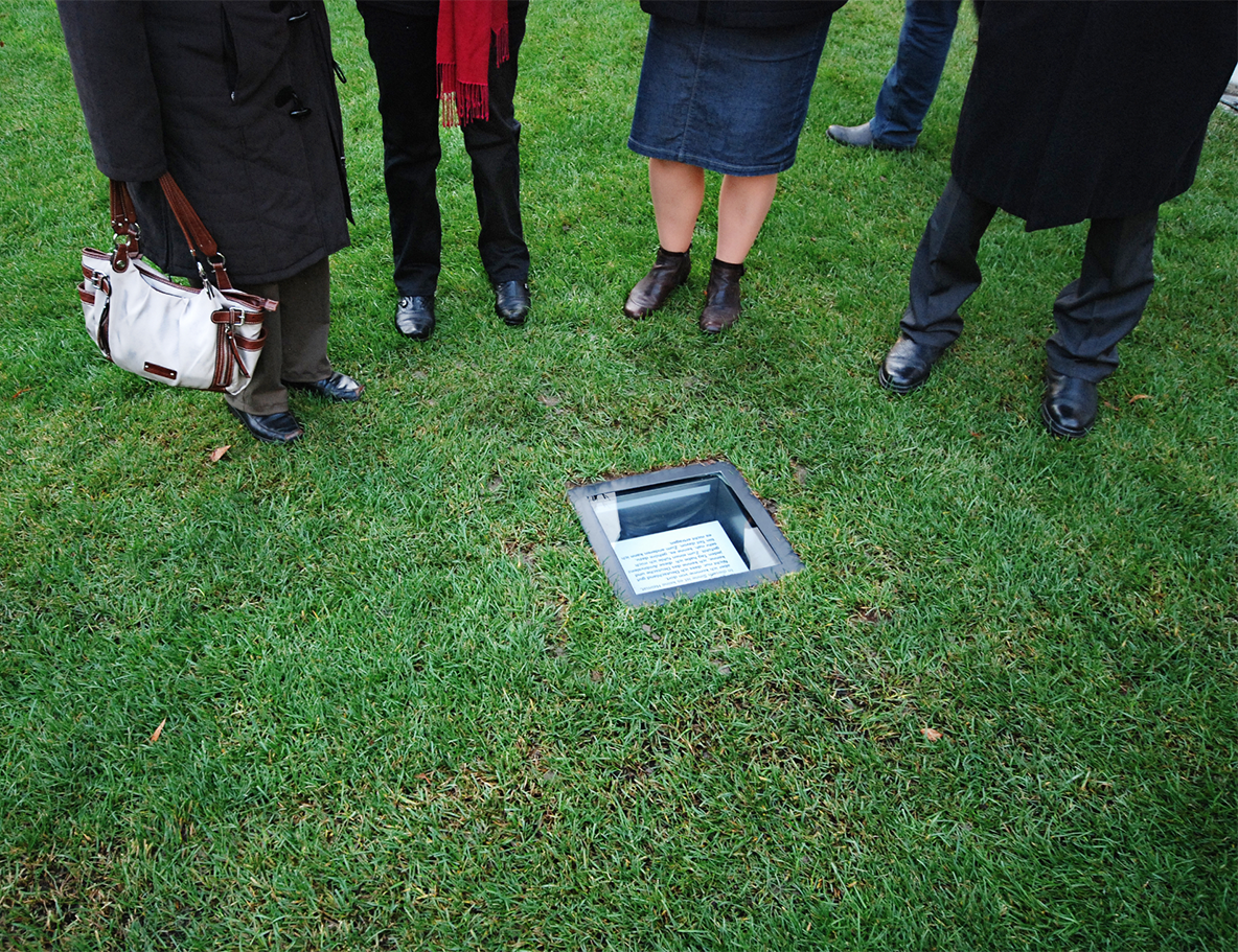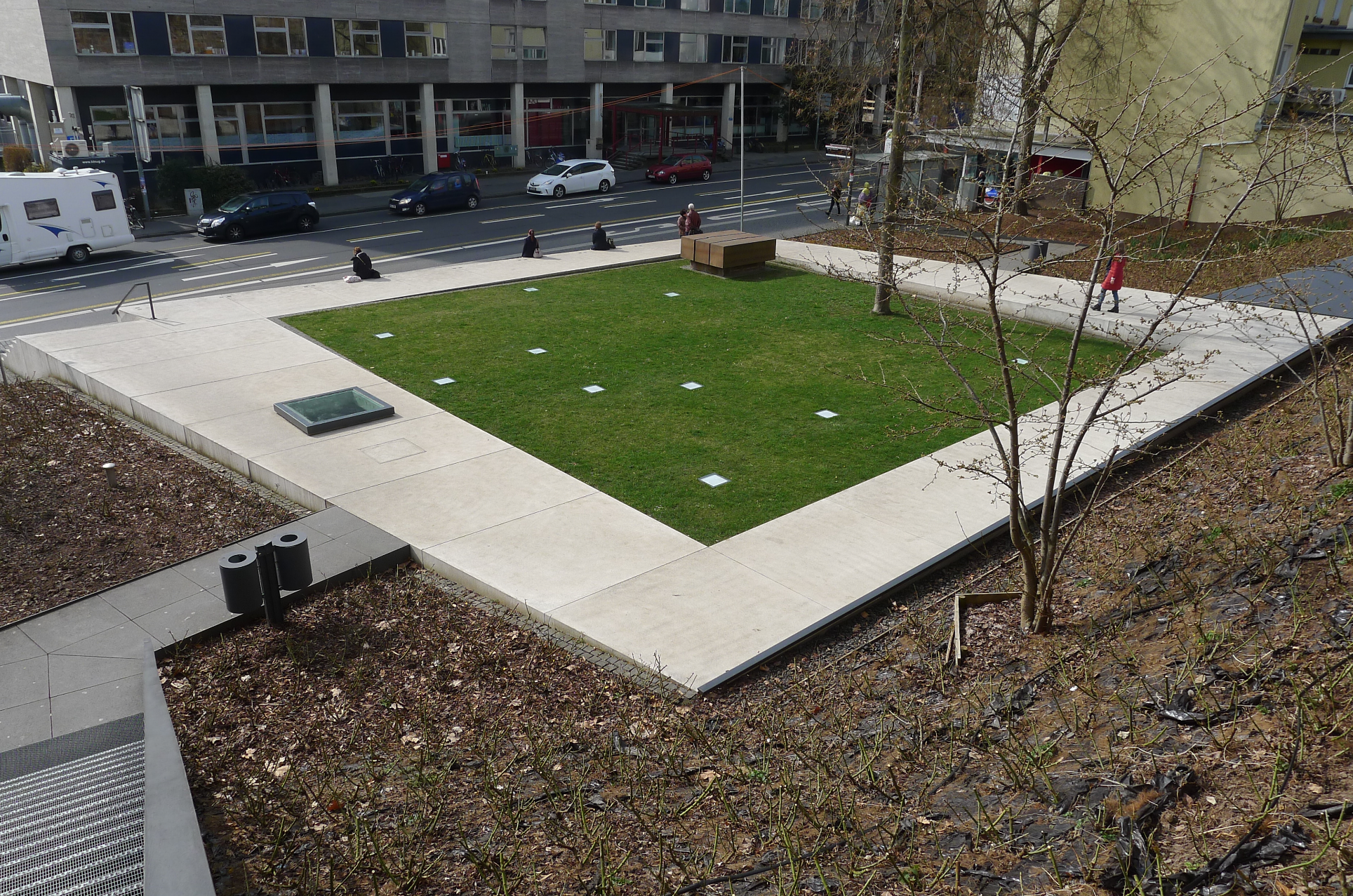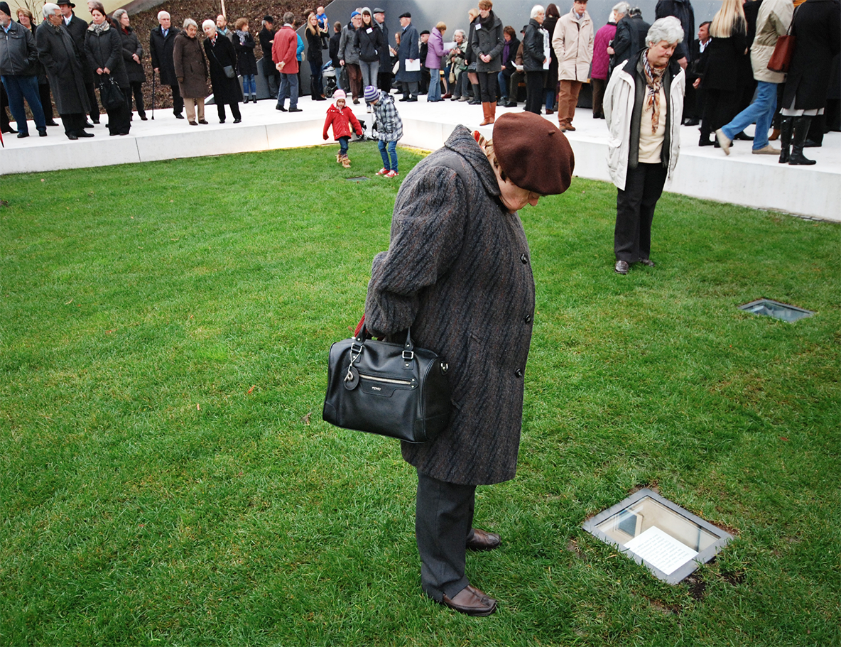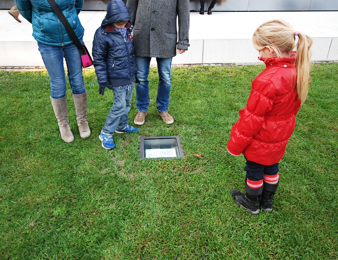 Slip box is the sculptural part of the redesign of the site of the former synagogue. The starting point is the spatial void, which stands not only for the destruction of a synagogue, but for the eradication of an entire culture. At this empty space, the site of the synagogue, 10 statements by former members of the Jewish community and their descendants can be read in ground-level glass boxes. This is the starting point of an ongoing dialog about the site and its significance: every year, the boxes are filled with statements from different groups of people that refer to the original quotes.