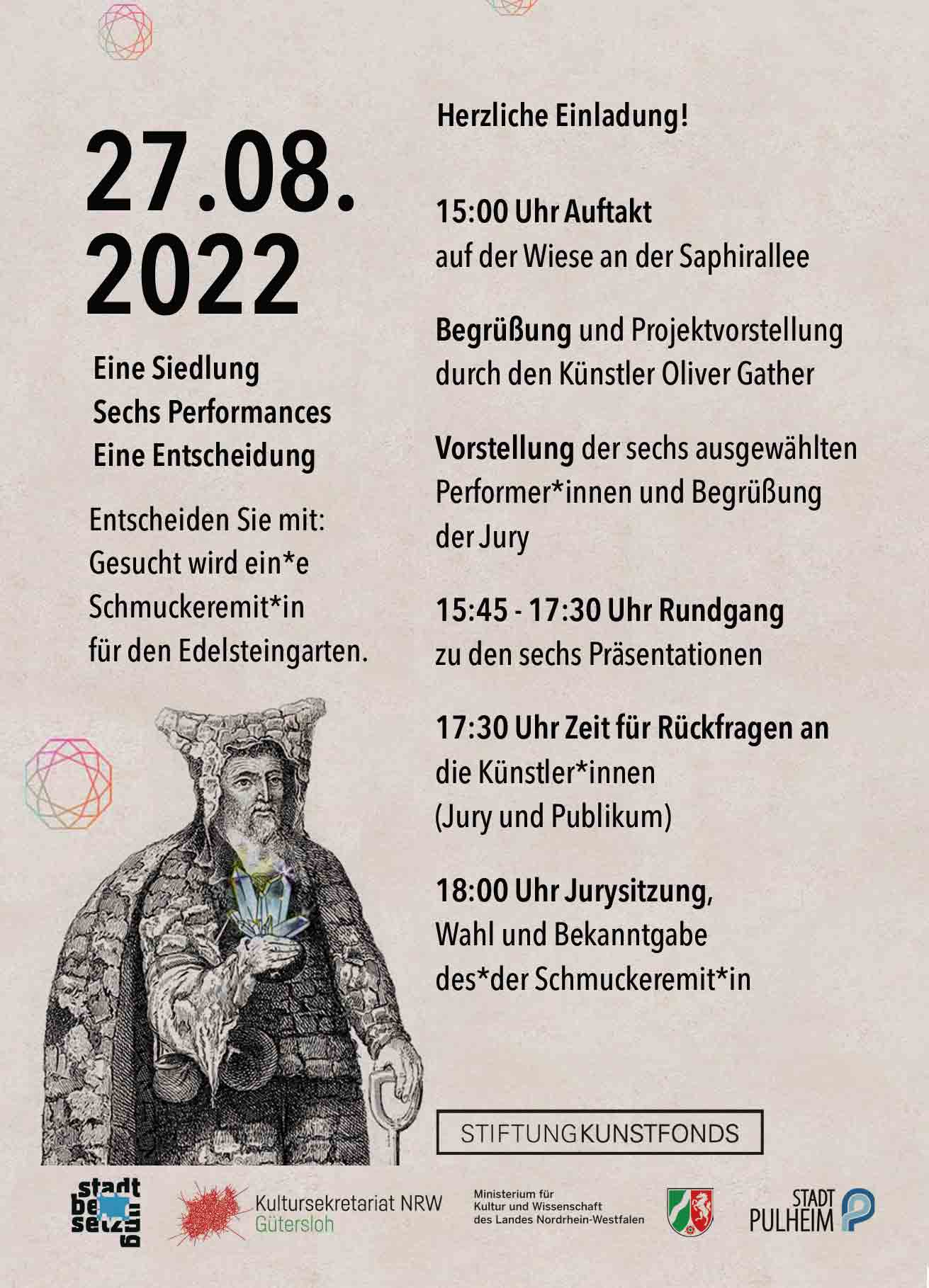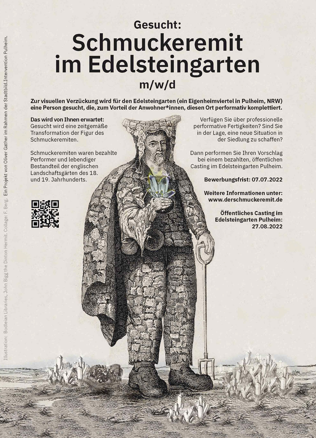 Oliver Gather’s research led him to the “ornamental hermits”, who were hired by English aristocrats from the 18th century onwards as living ornaments for their landscape gardens. English landscape gardens and the settlement “Edelsteingarten” (Garden of Jewels) are both stagings of an illusion of nature. The figure of the ornamental hermit was intended to complete the image of nature of his time and is now being transferred to the suburban housing estate. How can a contemporary ornamental hermit coherently intervene in the gemstone garden? As with the previous projects of the 18th century, a job advertisement was launched in 2022 to find performers who feel up to this role. What unrealised or unfulfilled longings and feelings can he*she embody in the Edelsteingarten?