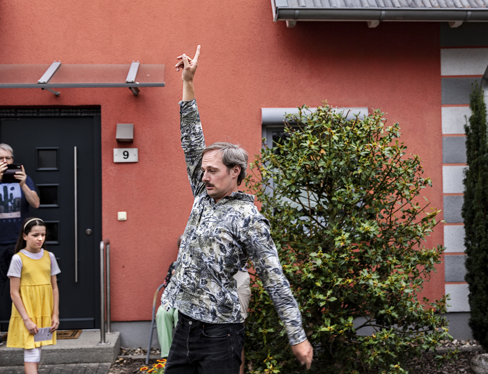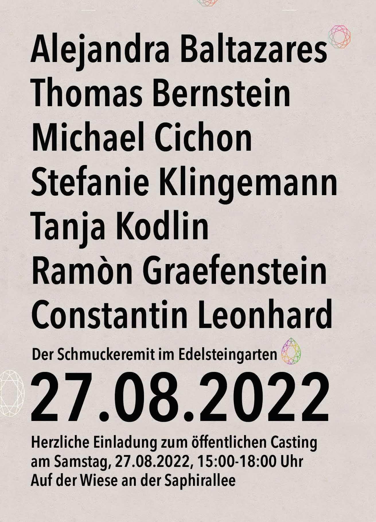 7 applicants (Alejandra Baltazares, Thomas Bernstein, Michael Cichon, Ramòn Graefenstein, Stefanie Klingemann, Tanja Kodlin, Konstantin Leonhard) developed performative interventions for the Garden of Jewels. In a public casting, the residents selected the proposal of the duo Ramòn Graefenstein and Tanja Kodlin to take up the position of the ornamental Hermit. The two performers listened in on the estate in 2023-2024, capturing wishes and desires and weaving them into a dense associative image. To summarise their work, they presented a final performative intervention in 2024.